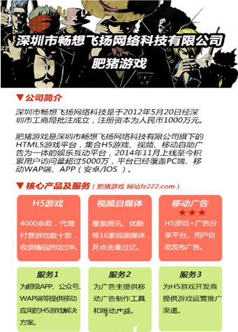 肥猪游戏自2014年上线,到现在已累计运营H5游戏超过4000款,累计用户访问(PV)超过5000万,累计UV超2000万,日独立访问IP超过10万;肥猪游戏同时还拥有着强大的视频生态圈媒体传播渠道,合作的视频网站覆盖搜狐、乐视、优酷、腾讯、56、爱奇艺、凤凰视频等。