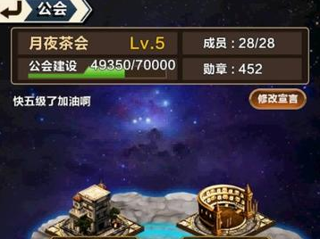 进入公会后发现公会主要有5个建筑,其中的【商店】主要是使用公会获得的勋章兑换物品,【成员】里呢可以看到现在公会的所有成员,其他没有太多东西就直接略过啦,下面我们主要看看其他三个建筑的玩法。