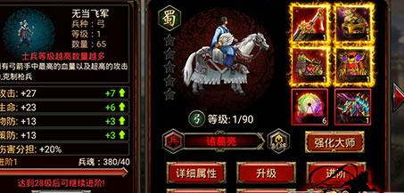 在《三国群英传》手游中,士兵们的作用非常重要!因为他们可以在战斗中攻击敌方武将、士兵,并为己方武将分担伤害。士兵基本属性包括:攻击(单体兵攻击力)、生命(单体兵血量,为0时士兵死亡)、物防(减轻物理型攻击,影响小兵体力的消减)、策防(减轻计策型攻击,影响小兵体力的消减)四种,玩家可以消耗兵魂对士兵进行升阶,从而全面提升士兵基本属性,在战斗中助你的武将一臂之力!