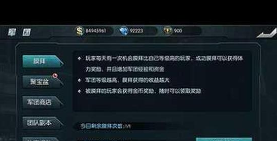 在《闪电突袭》玩家加入[军团]玩法中,玩家每日可有一次机会膜拜比自己等级高的玩家,成功膜拜可以获得体力奖励,并增加军团经验和资金,军团等级越高,膜拜获得收益越大。