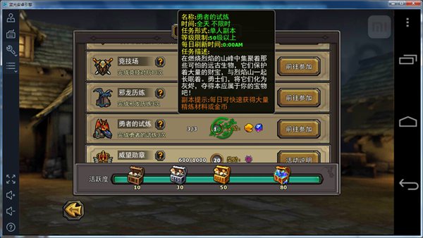 暗黑黎明中金币来源有很多,大多数小伙伴都停留在刷副本,卖装备换钱的阶段。但是很多小伙伴没有大量的时间刷副本,那么去哪获得日常所需金币呢?小编今天要给大家介绍的是,勇者的试练活动,花费时间少,获得金币多。