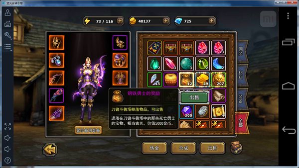勇者的试练主要掉落精炼石、精炼卷轴。当然还有金币,而且会掉落钢铁勇士的奖励、斗兽场印章和角斗士佣金三种物品。这些才是金币来源主力,分别能卖5000、1000和2000金币。别看一个卖钱不多,但是掉落量不少。算起来一次大约能卖10W以上。