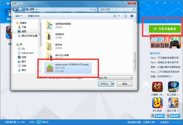 第三步:下载完游戏后,便可以运行第一步下载的系统模拟器了,点击右上角的安装本地游戏,然后选择已放在桌面的游戏包,选择自己喜欢的模拟器继续安装就可以了。