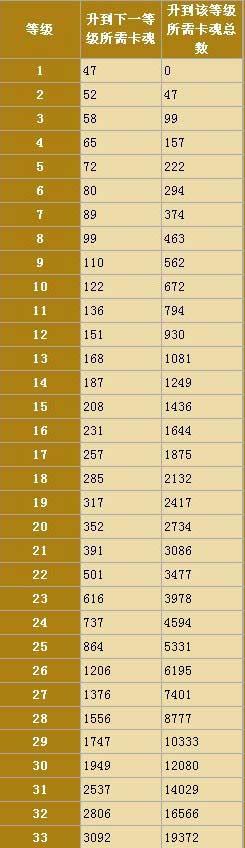 啪啪三国各武将1-33级升级所需卡魂