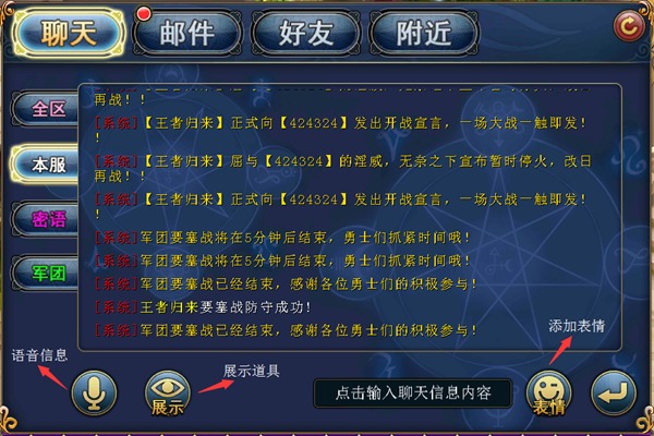 聊天:频道共分为区(需要魔法号角)、服、密语、以及军团4个;可通过按住语音信息键传输语音信息;点击展示可选择背包内道具分享到频道内;添加有趣的表情让枯燥的文字生动起来。