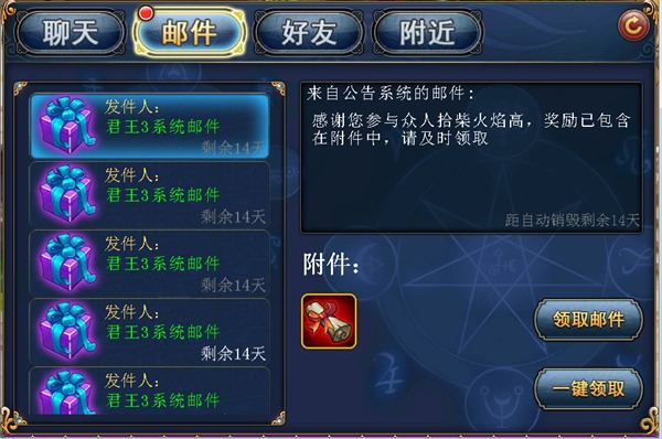 邮件:可以查看或收取玩家发送的信息、系统发送的活动道具奖励等等。