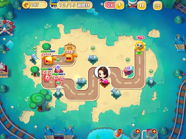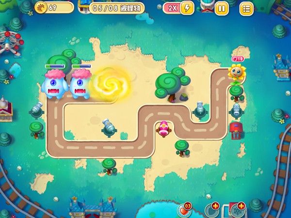 本关作为该3D主题的首个关卡,只有8波敌人,所以通关难度并不大。本关的防御塔配置只能建造圆珠塔,但也足以抵挡。即使你会觉得圆珠塔的攻击火力不够,但在新版3D主题关卡中每一关都会有明星防御塔助阵,强大的火力支援也是攻关的最大助力。