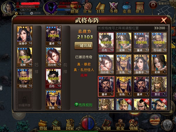董卓是游戏中最强大的肉盾,也是最容易获得的橙色武将(活动奖励,几乎人手一个),没有不派的道理。而五虎上将/五子良将实力非凡,而且五人技能不同,既有盾将也有DPS,方便布阵。最后再把诸葛亮、庞统放在后排狂轰滥炸,敌人哪有不崩溃的道理!