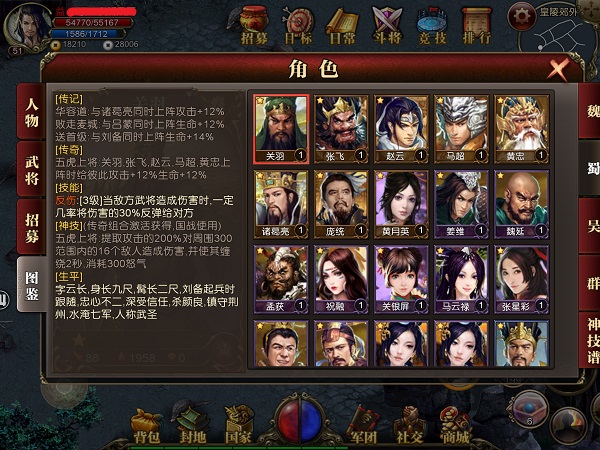 武将分工有了,具体派谁呢?大家一定注意到了武将组合系统,将特定的武将组合在一起,历史的羁绊将使其产生强大的化学反应,大大强化他们的实力。例如关羽、张飞、赵云、马超、黄忠,单独出战的话只是普通的武将,但如果让他们一起出战,“五虎上将”组合特效将使他们所有人的攻击和HP同时提升12%。因此,在满足阵型分工的前提下,能使用“套装”的话就尽量使用,效果绝对事半功倍!