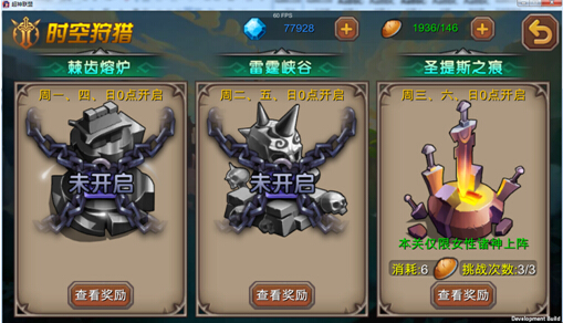共设置3个时空狩猎副本,分别产出不同的道具,按顺序在每个星期的某一天开放;