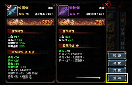 装备精炼可以增加装备的附加属性,获得精炼星级;