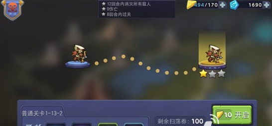 入口最后一关设有三星过关评价,除了完成基本的过关条件外,玩家可以通过达成额外目标来获得另外两颗星。攒满三星以后,关卡就可以进行“扫荡”和“十连扫”操作了。