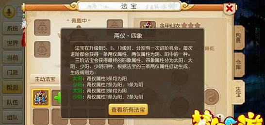 法宝在升级到5、8、10级的时候,分别有一次进阶的机会。每次进阶都会获得一条两仪,两仪属性为阴、阳中的一种。三次进阶后,拥有三条两仪属性时,会根据这三条两仪属性自动获得一条四象属性。四象属性赋予法宝一个特殊的效果,包括四种:太阳、少阳、太阴、少阴。