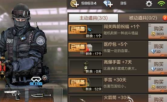 1、随着难度慢慢的增加,对玩家的战斗力也逐渐有了更高的要求。在战斗前,建议大家可以在备战大厅内购买主动道具,如闯关阵前祝福,可随机获得一个战场增益buff,并携带医疗包、手雷等战场补给道具,RMB玩家可以花费钻石购买被动道具防弹衣或者防弹头盔,可以减少角色躯干和头部受到的伤害。