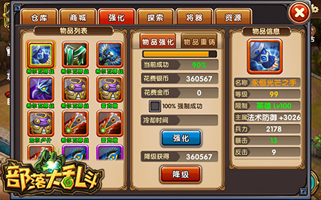 在游戏中,及时地更新装备,巧妙的进行搭配,也是获得成功的一大途径。在游戏中,很多玩家并不了解装备的重要性,前期胡乱的进行搭配和升级,导致后期的囧境。正所谓,好钢用在刀刃上, 前期玩家只需要注重好攻具和防具即可,把前期的银币都花在这两类装备上即可。另外,橙紫红黄绿蓝白,橙装为最高级,白装为最低级,前期应该及时更换高阶装备。