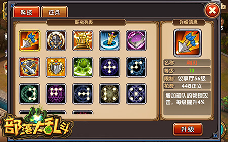 科技是第一生产力,这话绝对是真理。和平年代的我们,科技的第一作用在于发展生产。而在纷争的艾泽大陆,提升利刃、盔甲、抗性、应征、草药等成了重中之重。而且,科技还能升级阵型,科技中提供了十种阵型,根据敌人的情况,选择恰当的阵型,往往能够起到不战而屈人之兵的效果。