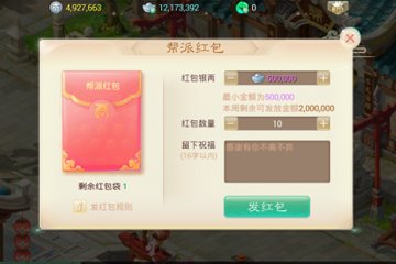 2、发红包:使用“帮派红包”,按要求输入必要信息,即可发放装有众多银两的专属帮派红包(玩家可领取自己发出的红包,24小时未领取的红包将会退回)。