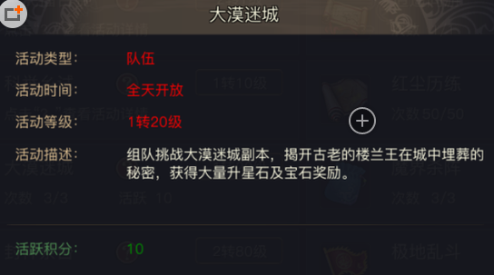 活动描述:组队挑战大漠迷城副本,解开古老的楼兰王在城中埋葬的秘密,获得大量升星石及宝石奖励。