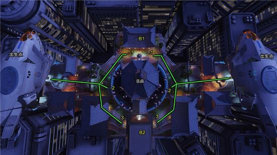B2是位于一个通道的内部,其中有一个血包,埋伏在此可以打击从B点内部屏风另一侧涌过来的敌人,需提防被敌方线路3的进攻所消灭。