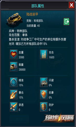 陆战装甲是很稀有的特种部队,你只能从活动【装甲猛兽】中获取。陆战装甲的攻击范围是单体,而它最大的特点是克制常规部队,尤其对战争工厂中可生产的单位都有额外伤害!而且它还能为己方所有部队增加15%的命中率,高命中率让攻击力更加爆炸!