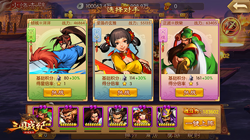 每次遇敌时,玩家都可以自行选择简单、中等、困难三种不同难度的敌人。当然难度越高的敌人,奖励的积分和星级也越高。其中,积分可以不断累积,达到一定积分可在“奖励”中领取蔡文姬、董卓碎片等奖励,星级则仅限当日使用,兑换加成BUFF,强化队伍战斗力。