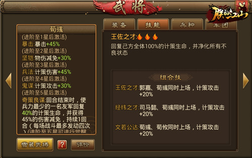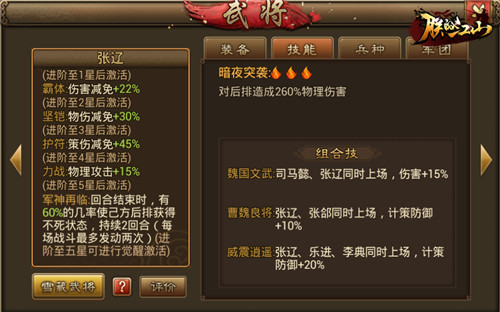 接着是张辽+荀彧两名保命神将登场,一身减伤天赋的张辽可以作为第三个前排,觉醒技能“军神再临”保命神技可以保护后排至少两回合,且可以触发两次。而荀彧作为大奶,可以清楚负面状态,每回合结束还可以帮助血量最少的队友回血,并让其获得45%的伤害减免。两名武将同时在场,减员是不存在的。