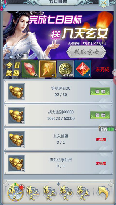 玩家每日完成对应目标内容即可获得海量元宝,完成当天所有目标任务还能获得奖励大礼包,完成7日所有目标即送高级天神——九天玄女。哇塞,九天玄女可谓是小编一直以来的心头好了,只需七天就可获得,简直不要太简单哟!