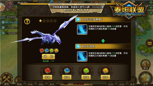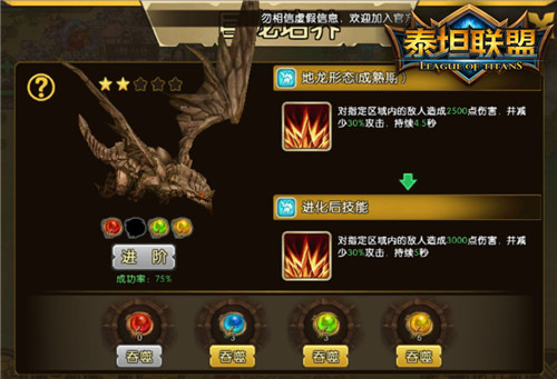 如果你集齐了四种龙珠,然后都喂给了你的巨龙,那么你的巨龙就可以进阶了。进阶成功之后巨龙将会提升星级,其技能的伤害随之大幅提升,属性加成也会更强。再次进阶需要重新吞噬四种龙珠,越高星级进阶概率也越低,高星神龙不仅需要大量的龙珠,也需要欧皇的运气哦!