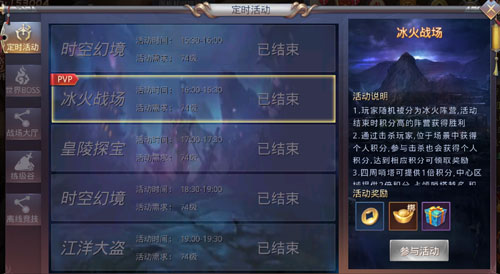 每天下午16点,《笑傲仙途》午后冰火战场准时开启,全服玩家等级达到74级即可参与,进入战场后玩家将会被随机分为冰火阵营,在限定时间内相互厮杀,活动结束后积分高的阵营获得胜利,得到胜利阵营奖励礼包。而无论阵营胜利与否,在冰火战场表现突出的玩家,个人积分达到一定额度后可自动获得对应积分奖励,包括海量进阶材料、绑元和铜币。