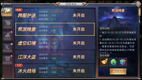 群雄帮战,不同帮派守护旗帜,全天活动,24小时活动不间断。