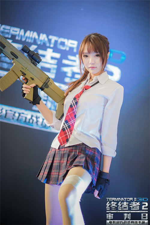 两位美女cos的是《终结者2:审判日》中的女性角色——化身为终结者的未来战士。她们所穿的服装是游戏中的时装外观,制服裙装清纯可爱,野战套装泼辣性感,充分展现了女性战士的多元魅力。配合精致逼真的枪械道具,会玩枪的小姐姐火力爆发,现场撩动了众多游客的热情,展台四周一时人满为患。