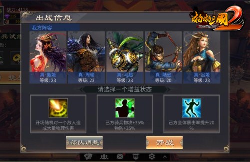 同时,每次挑战前,主公们会获得一个“BUFF”加成,或开场随机对一个敌人造成大量物理伤害、或己方骑兵物攻、物防增加、或提升己方全体暴击率等不同内容的效果,选择一个适合自己阵容的增益BUFF是制胜的关键哟!