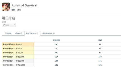 《Rules of Survival》累计登顶全球41个国家和地区App Store游戏免费榜