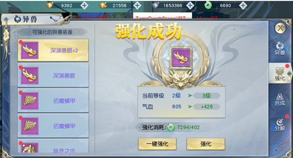 我们不可能无限制地刷取大量的装备来分解,从而获得大量的异兽装备强化材料,也不可能期望自己有连续的好运,天天掉落极品的异兽装备,所以,是优先强化还是优先合成,这就需要对资源进行合理的分配,做出一个明确的选择。