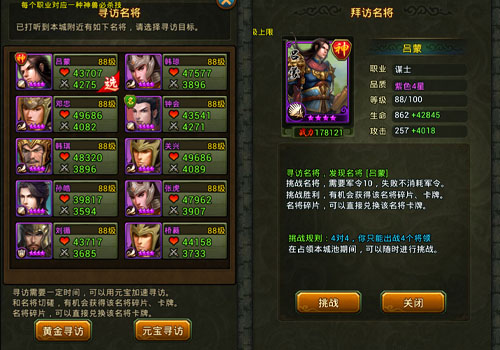 占领城池之后可以使用黄金或者元宝寻访该城池附近的将领,使用黄金寻访需要等待一定的寻访时间,使用元宝寻访则可以立即寻访该将领。成功击败寻访将领可以获得将领卡片或者碎片,如果寻访的是神将,那么一定可以获得该神将的专属神兵碎片!