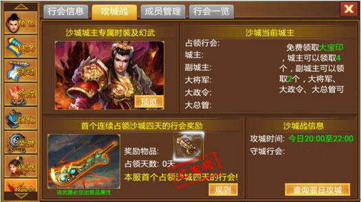 为了福利,相爱相杀,攻城战在每天晚上20:00-22:00进行,只要报名了的行会都可以参与,不过这里有个特别要记住的地方就是,周四不会进行攻城战,因为在周四,系统会收回沙城占领权直到下次攻城战后重新分配。