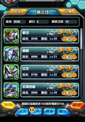 跻身前列,赢取强者待遇。在6637手游《高达无双》当中,对于每一名进入到格斗场当中的机师,都会获得其相应的排名。而格斗场排名,依据的并不是机师们的实力,而是机师们在格斗场当中所进行的挑战。在格斗场当中进行挑战的胜利次数越多,机师们就可以获得更加靠前的排名。而更高的排名,也就意味着更为丰厚的奖励。此外,在格斗场当中,机师们还可以获得格斗积分,可用来兑换S级扭蛋、红色素材卡、橙色合金等珍贵的物品。