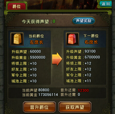 爵位步步高升,各种福利不断!当玩家每次完成声望任务之后,就可以获得声望,随着声望的累积,可获得不同的爵位。消耗一定数值的声望和黄金就可以晋升爵位,晋升爵位即可增加将领、好友、军令、城池上限。攻城略地中可以攻占更多的城池,抢占更多资源,称霸三国快人一步!