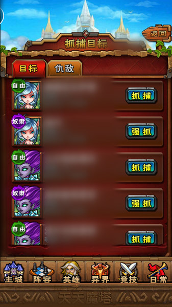 战俘,《天天魔塔》中所以奴隶都来自竞技场,在玩家开启竞技场后,只要在竞技场击败其他玩家,那就可以把他或者她收入你的奴隶预备名单,注意只是预备哦,想要把其真正变成你的奴隶还有一个步骤要走,就是抓捕。
