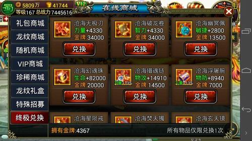 金牌可以兑换沧海系列装备和超强5金星卡片(每件装备只能兑换1次)。这些装备、卡片都是一顶一的超级极品,对玩家来说可谓梦寐以求!其中某张卡片几乎可以直接提升武将30%的战力……一旦筹集到足够的金牌时,一定要谨慎选择第一个兑换物品!虽然力量卡超酷炫,战力提升吓死人,但龙纹狗仔队在此仍然强烈建议先兑换敏捷卡,高敏才是王道呀!!!