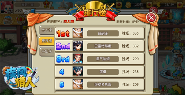 参加竞技场,自然要在排行榜上争得一席之位。《疾风猎人》中有战力榜、竞技榜、等级榜三个榜单。其中竞技榜会以玩家的胜场次数来衡量,要记得每天挑战哦!