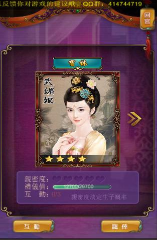 在《武则天OL》中妃子的礼仪值可通过互动来获得的哦。而互动该怎么来做呢,这是你该去妃子的宫殿来跟妃子做亲密接触,是不是想想就很激动呢?通过互动页面,我们有三种方式可以选择与妃子来互动,一天中有3次机会与妃子来互动,互动所获得的亲密值是可以宠幸妃子的哦,众多妃子任你宠幸可得把持住哦。
