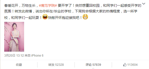 范冰冰微博发布的“校园召集令”