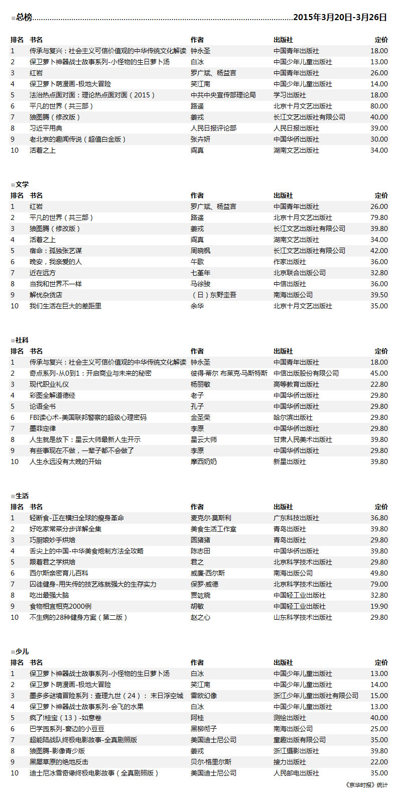 注:京华时报图书排行榜是根据北京图书大厦、开卷公司、中关村图书大厦、当当网书店、京东网书店、三联韬奋书店等图书销量统计数据综合而成。