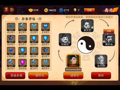 不同的卦象拥有不同的效果,在《囧西游》中每个伙伴最多可以佩戴4个卦象。在选择卦象上,也是有所要求,首先主角的卦象选择要根据玩家所选择的职业。但无论是哪个职业建议以生命、攻击、暴击这三个为主,因为主角是玩家重点培养的对象,即使是前排也是主力输出点,剑使的攻击一点不逊于其他伙伴。