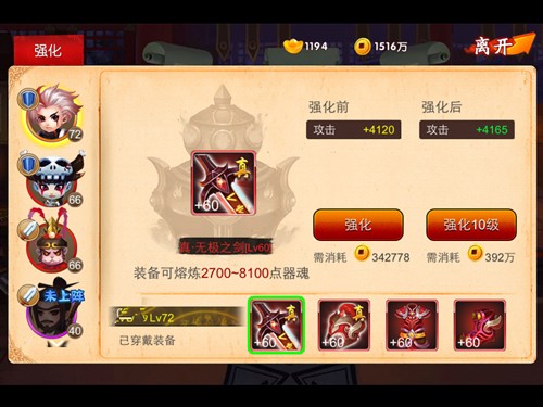 在铁匠铺中玩家可以将有提升攻击力的武器、头盔、鞋子进行装备强化,在《囧西游》中前期就可以一直强化装备,即使要更换装备也可以将强化后的装备进行熔炼来获得器魂。装备还可以通过进阶石进行进阶,即使失败也只是扣除进阶石,装备并不会消失,并镶嵌带有攻击属性的仙石在装备之上。