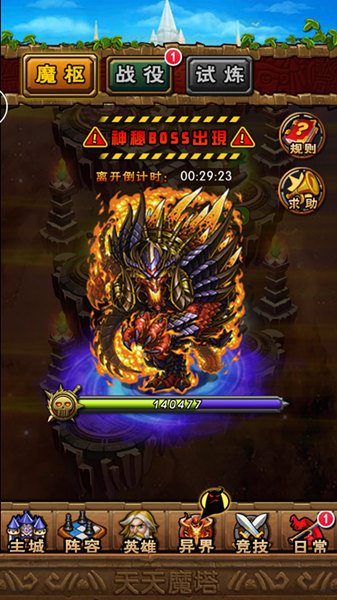 魔枢挑战,这是一个“爬塔”副本,玩家可以不断的挑战各种BOSS获得“灵魂契约”,有了契约玩家可以在兑换商店换取各种英雄碎片,这是游戏里玩家获得英雄的主要方式之一。