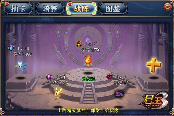 呆萌精灵大点兵,在精灵阵战中最多可以上阵5个精灵。角色可以获得上阵所有精灵带来的属性加成。而跟随出战的精灵,则堪称你的全能小帮手啦,火性精灵可以伤害输出,水性精灵可以防御,雷电精灵可以控制,光系精灵可以治疗,暗影精灵可刻字,除了百分百空手接白刃,只要你想不到,没有它们做不到,真是打怪战兽的好帮手!