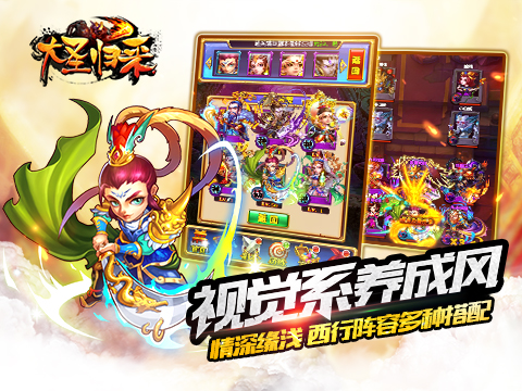 视觉系西游策略卡牌手游《大圣归来》满足了广大西游粉和卡牌粉丝的终极梦想,精美人物与华丽战斗的超带感视觉轰炸,人人可得上万元元宝的极致福利体验,波澜壮阔的西游背景,缠绵悱恻的爱情故事,多种创新玩法,一同来感受2015全新视觉系巅峰卡牌经典之作的超震撼体验吧!