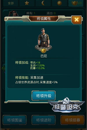 高阶将领携带各式技能,只需上阵立刻生效;其技能大概分为五大类,增加先手值(更容易优先出手);攻打资源据点(采集速度、己方伤害增加、敌方伤害降低、战胜经验增加);攻打关卡(增加经验,己方伤害增加、敌方伤害降低);进攻基地(更加扣除目标基地繁荣)守卫基地或资源点(降低敌方伤害)。也就是说,每位将领或者都会各有不同,因材施用,让各类将领站到合适的岗位上,才考验名指挥官的眼光!换言之,无脑一键设置最大战力的时代已经完全过去!游戏里策略成分的对拼将进一步成为主流!